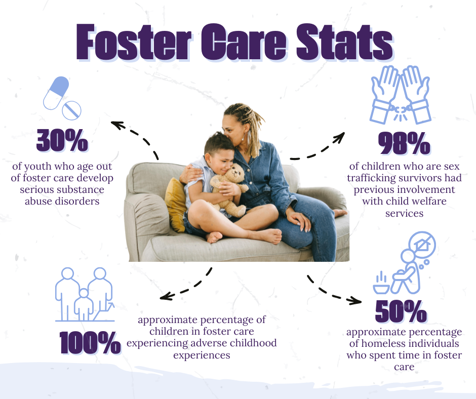 - 30% of youth who age out of foster care develop serious substance use disorders, and 50% to 75% of foster youth experience substance use issues by young adulthood